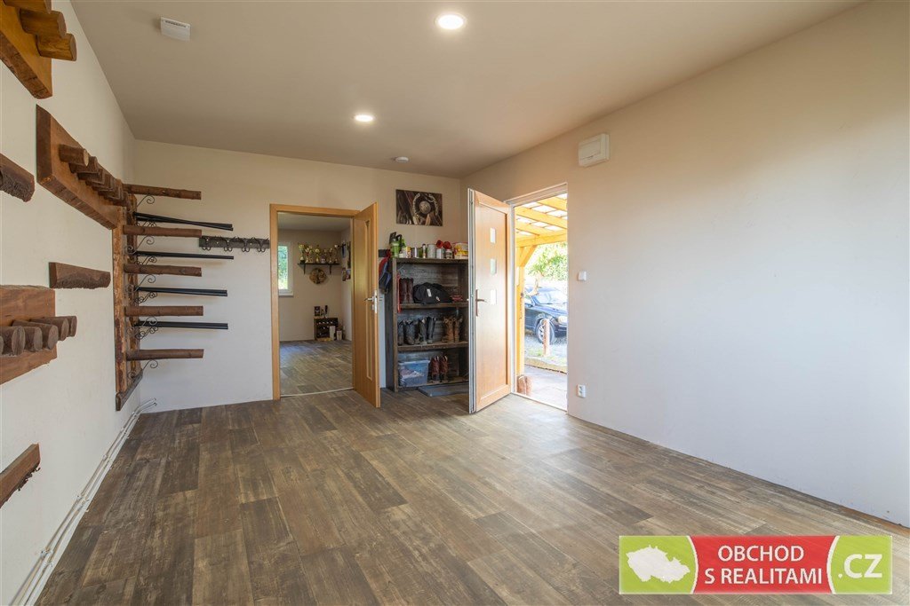 Dále se na pozemku nachází samostatná stavba hobby domku, která obsahuje dvě místnosti, každá s výměrou 20 m2. Na hobby domek navazují krytá parkovací stání. I tato stavba je napojena na rozvod topení z tepelného čerpadla, a tak je možné místnosti temperovat, případně je k dispozici komínové těleso s kamny.