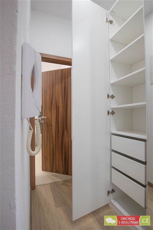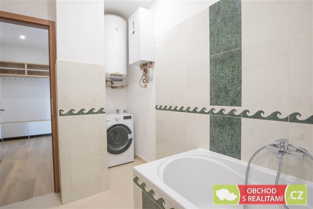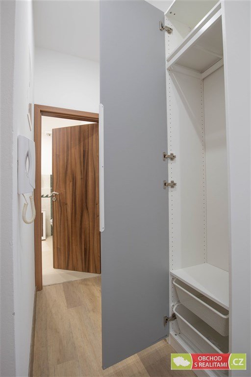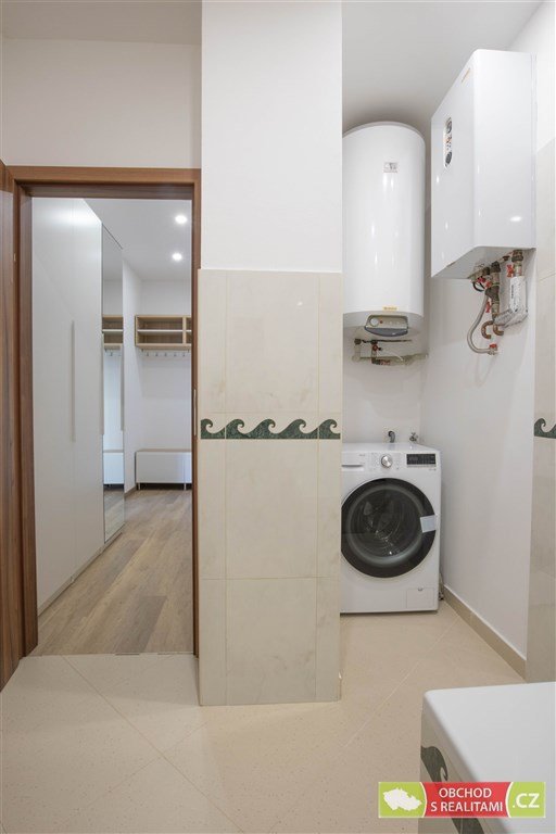 pračka se sušičkou, v chodbě jsou nové skříně. Z obývacího pokoje je