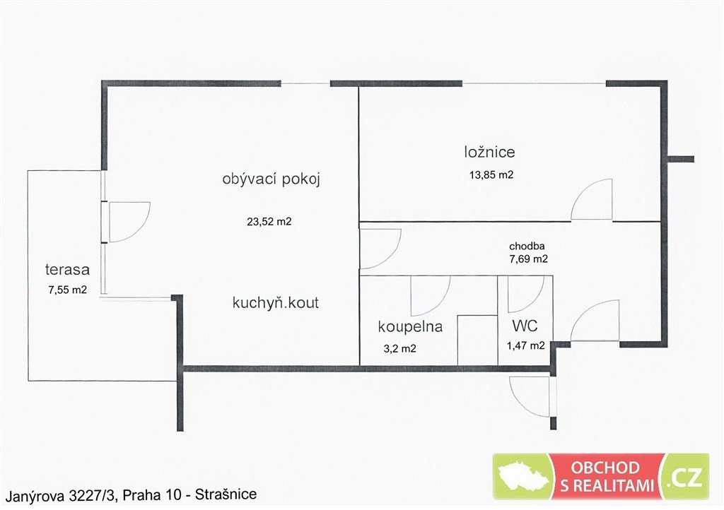 Dispoziční plánek s výměrou jednotlivých místností přikládáme. Z obývacího pokoje s jihozápadní orientací je výstup na terasu. Kuchyňská linka je vybavena pečící troubou, varnou deskou, digestoří a lednicí s mrazákem. Myčka není součástí nájmu, ale je zde prostor pro její umístění a instalaci. Koupelna je vybavena vanou, WC je samostatně. Pračka se sušičkou není součástí nájmu, oba tyto spotřebiče je možné umístit do koupelny. Ložnice má severozápadní orientaci. Byt je nabízen jako nezařízený. Podlahovou krytinou v obou pokojích je plovoucí podlaha.