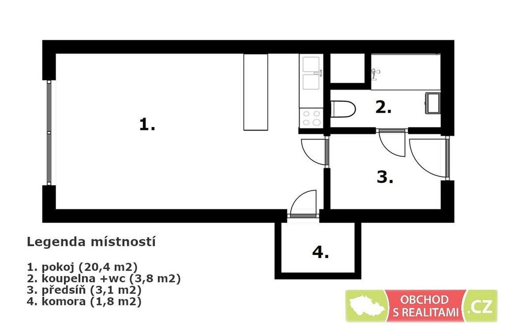 plánku. Výměra hlavní obytné místnosti je 20,4 m2, komory 1,8 m2,