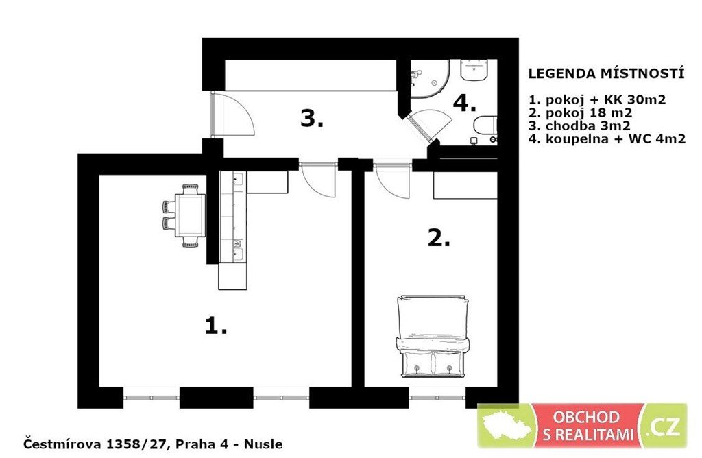 Bytová jednotka 2+KK o velikosti 55,3 m2 se nachází ve 3. patře