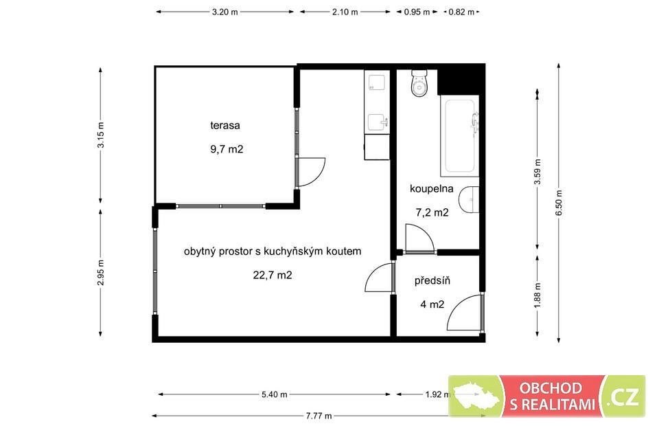 9,7 m2 se severozápadní orientací, se nachází ve 2. nadzemním podlaží