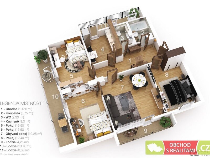 4+1 s navzájem neprůchozími místnostmi, výměra bytu je 83,2 m2 +