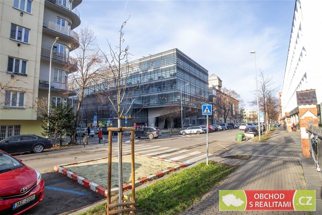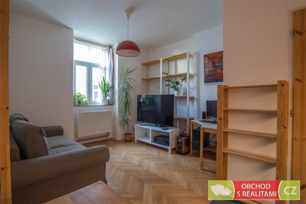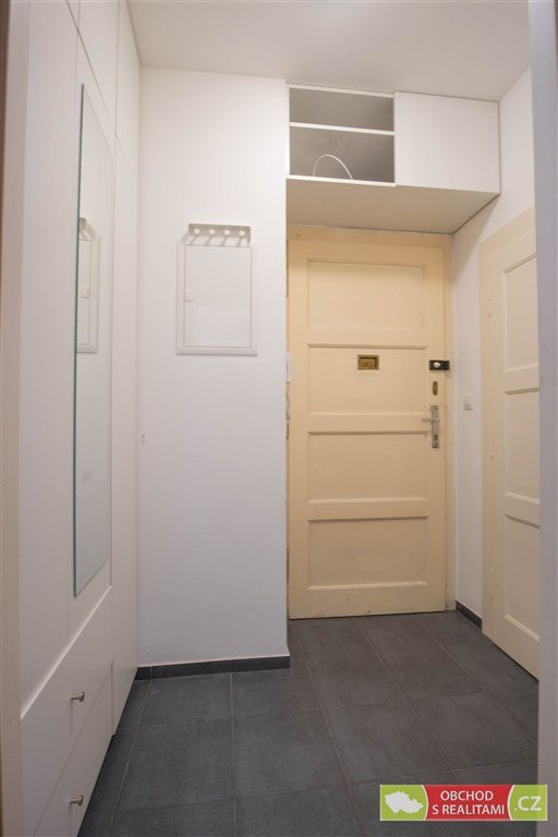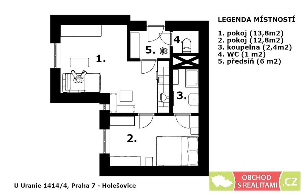Plně zařízený byt s dispozicí 2+KK o velikosti 36 m2 se nachází na adrese U Uranie 1414/4, Praha 7 – Holešovice v 1. patře s okny orientovanými do klidného vnitrobloku (žádný hluk ze silnice).