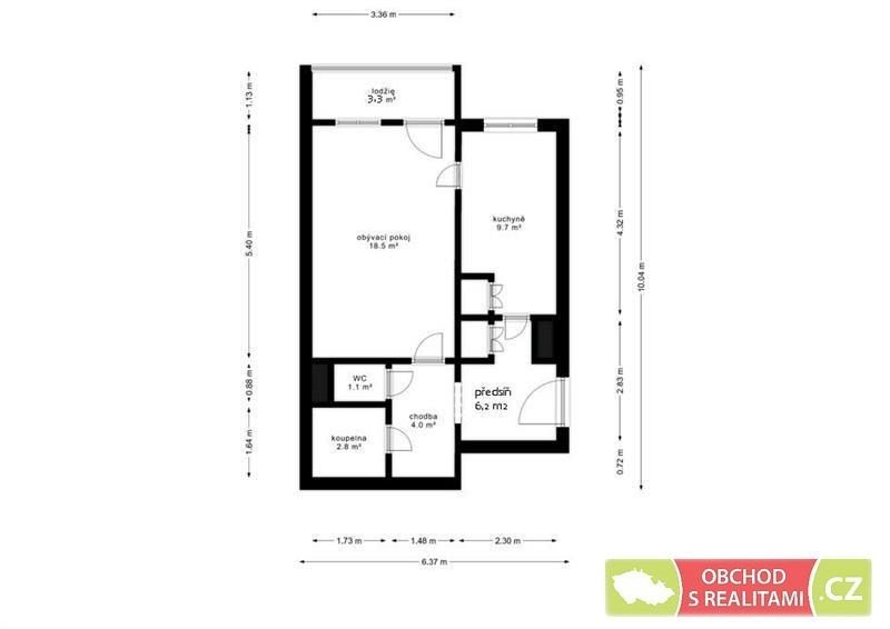 Výměra bytu je 45,5 m2 + lodžie 5,43 m2 + sklep 1.21 m2, dispoziční