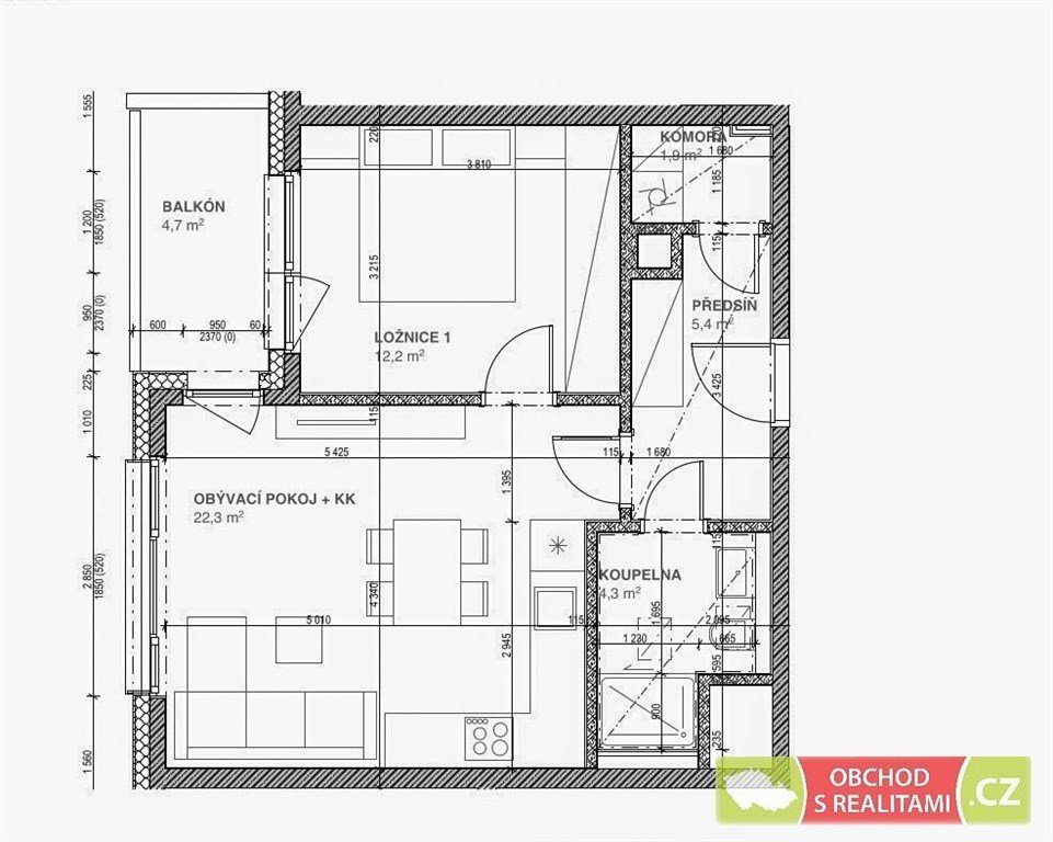Bytová jednotka 2+kk s balkónem, který je přístupný z obývacího