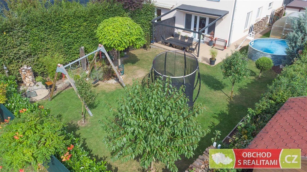 terasy; na zahradu byl umístěn nadzemní bazén, skleník a zahradní domek