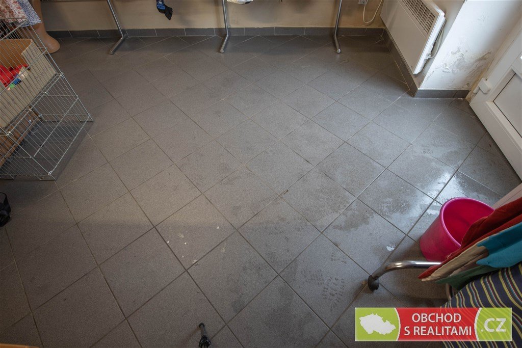 V obchodním prostoru je položena dlažba, výloha i vstupní dveře jsou
