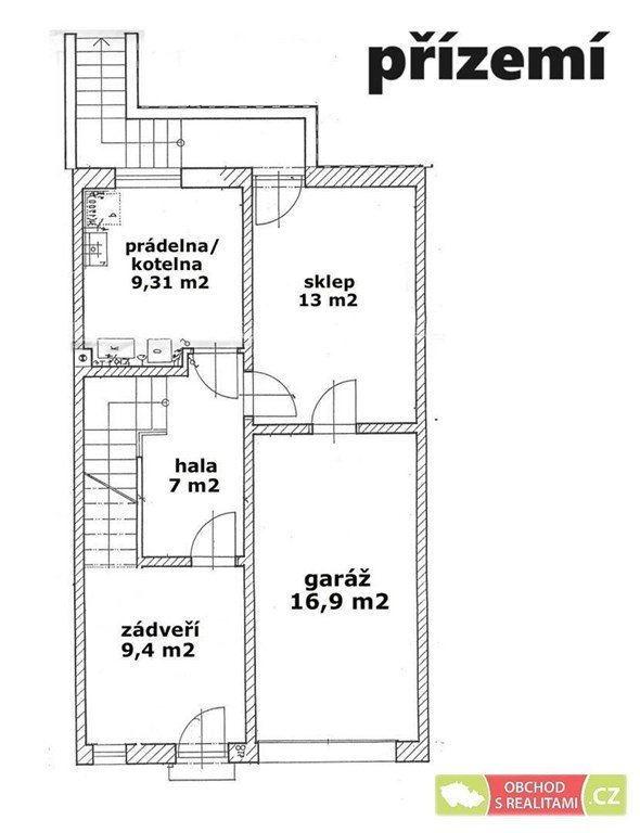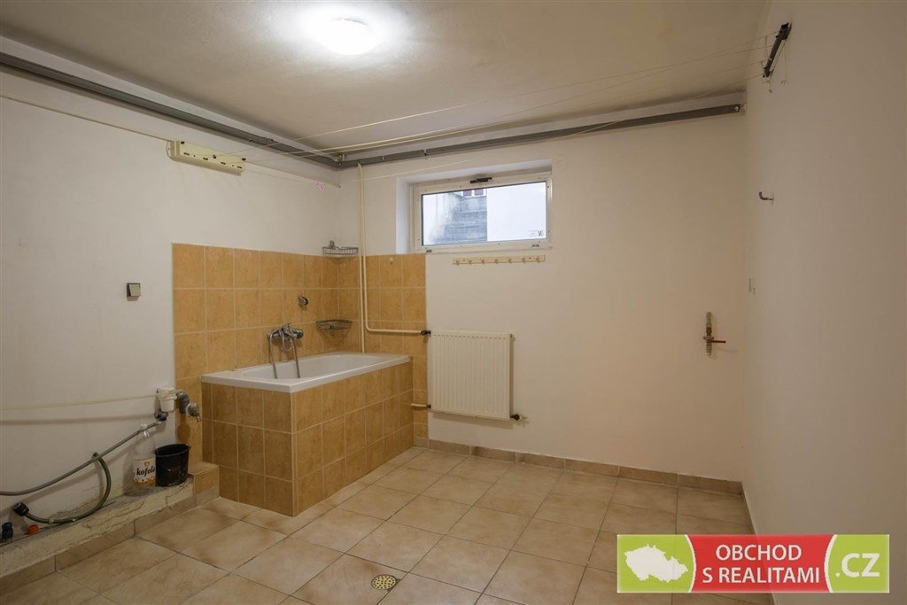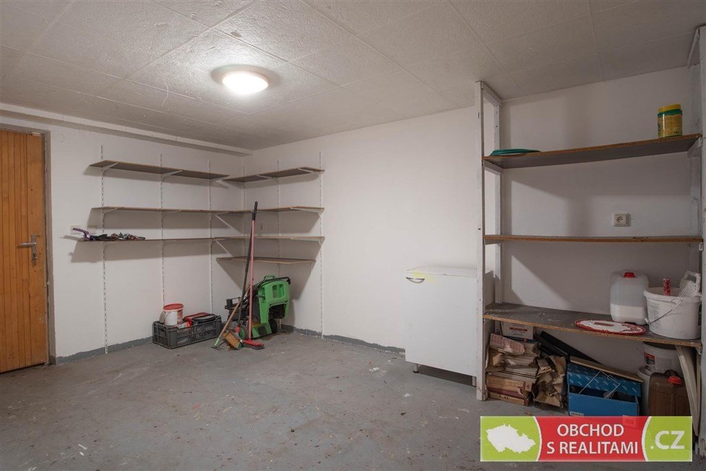 Přízemí domu nabízí sklad s regály, technickou místnost s vanou „pro
